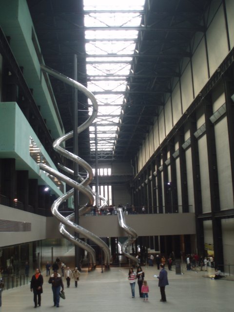 london-tate-modern-turbine-hall-carsten-holler-exhibition.jpgAn hour later, the depths of the turbine hall call me back. The current exhibition here comprises a silver stream of frighteningly steep helter-skelters twisting from the museum’s upper levels into the cavern far beneath.