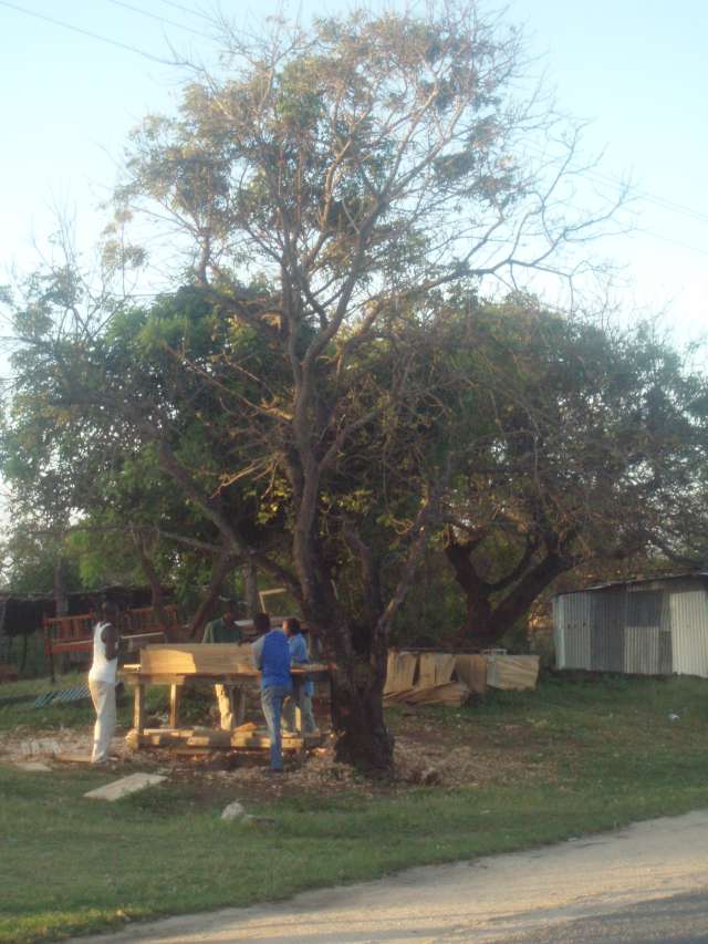 carpenters-shop-roadside-kenya.jpgAnother mimosa tree, and in its shade a guild of carpenters is hard at work, planing furniture from darkly sumptuous wood. What they’re making I’m not quite sure – a piano, a desk, or a coffin, maybe ?