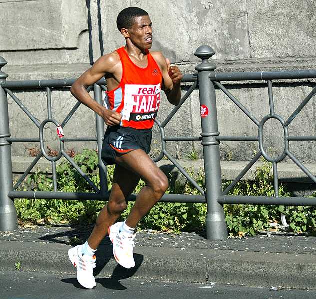 haile-gebrselassie-marathon-world-record-holder.jpgWe run on. Near the final turn, at six kilometres, Sweder grins as he runs the other way. After just half an hour, he’s three minutes up already.