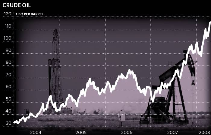 When this article appeared in February 2008, the oil price stood at $87, down from $100 in January. Less than three months later, the oil price is hovering close to $120. The graph below from The Independent illustrates that rise.