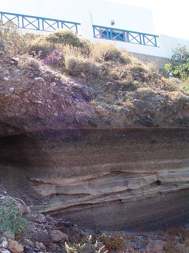 cross-bedded and channelised volcaniclastics vourvoulos santorini by roadsofstoneThe church of Agios Ioannis (St John) lies up ahead. Not far beyond lies the pretty beach of Monolithos, with Vourvoulos hidden further on. Quiet, dreamy hideaways these, floating in the forgotten corners of a tourist island — yet still recalling the violent history of this place.