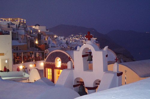 nightfall in oia santorini greece by roadsofstoneI turn and gaze back across the island. New visitors fly in here now, each and every day. That’s because high above me, atop the crater rim, the sunken caldera hosts some of the most spectacular sunsets seen on Earth.