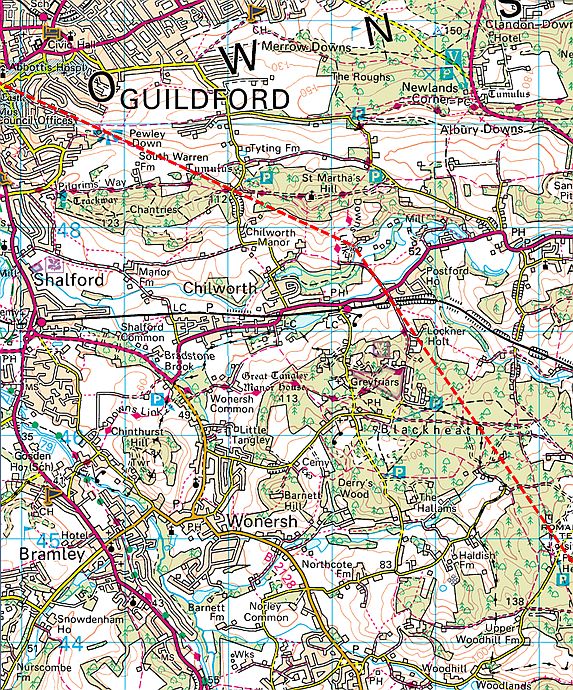 Eventually, I see it — a straight line from Chilworth to a fording place across the Tilling Bourne, then striking left along the southern flank of St Martha’s Hill.
